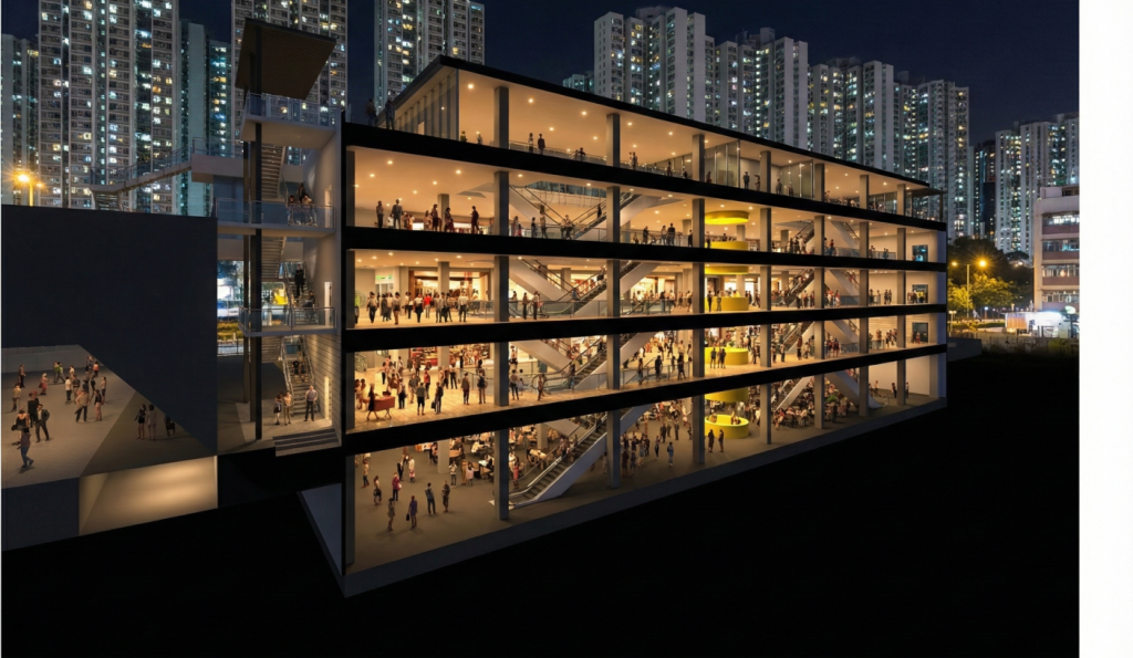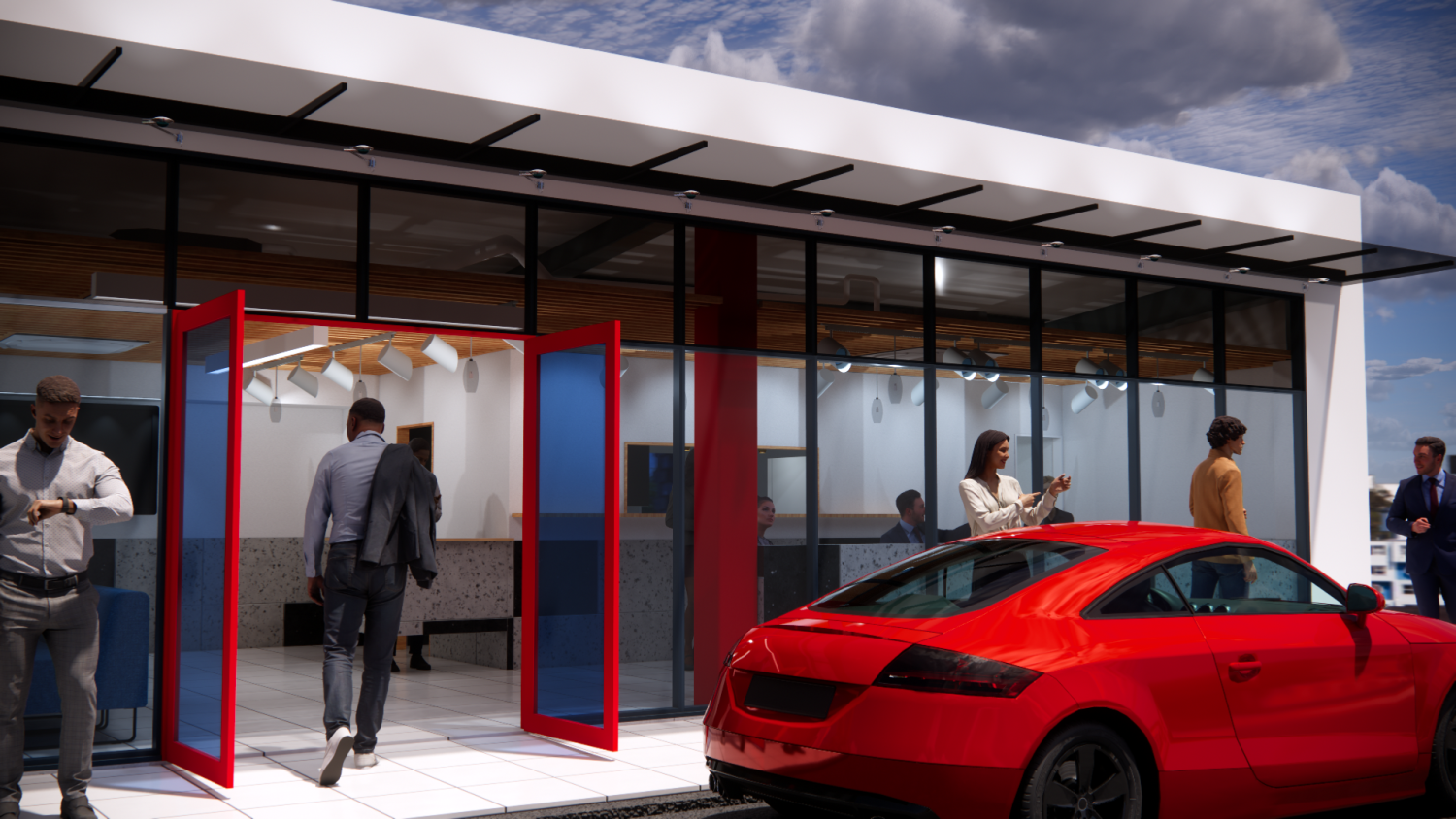 右側のベクターワークスの画像をNano Bananaにアップロードし、ショッピングモールの日中、人と自動車を多めに配置、なぜか正面向きになりました。