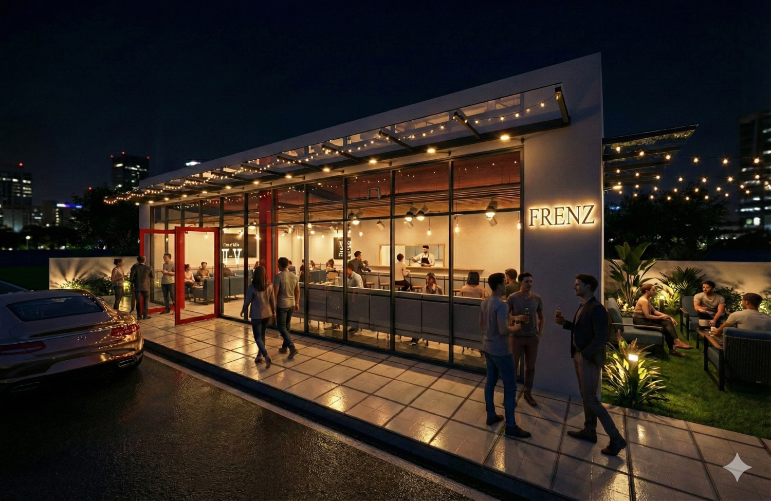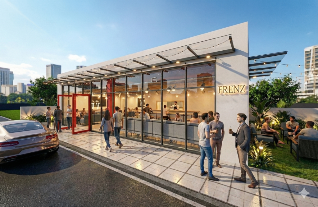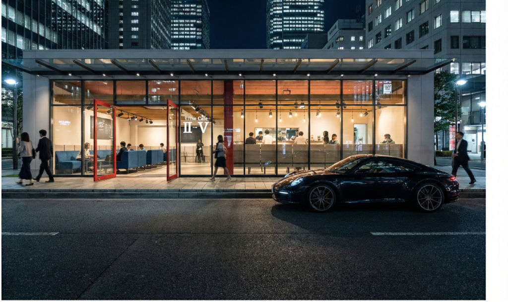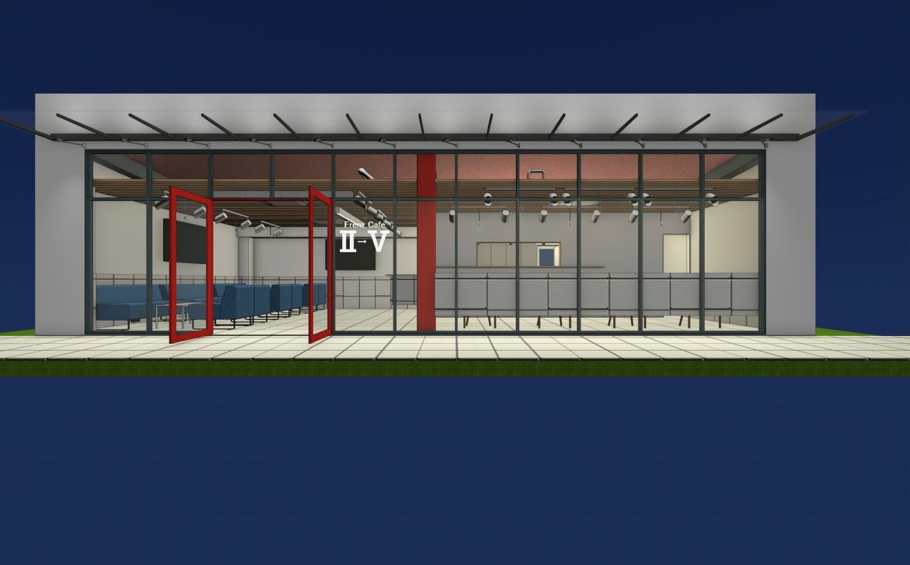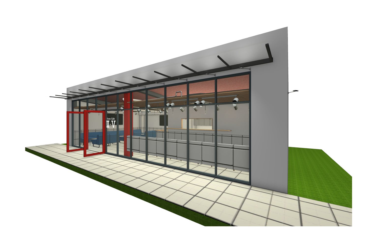 右側のベクターワークスの画像をNano Bananaにアップロードし、条件はフォトリアルにカフェの外観、道路に自動車、店内と外に人を配置照明の配置、ロゴマーク、これだけです。