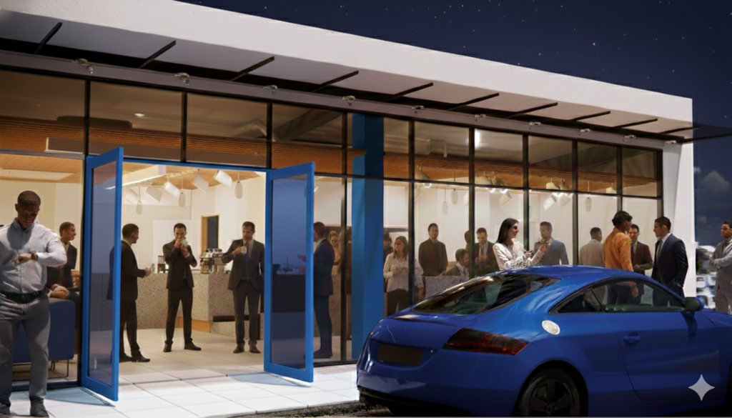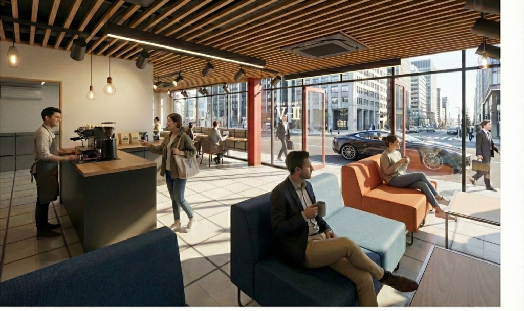 右側のベクターワークスの画像をNano Bananaにアップロードし、条件はカフェの内観、人物の配置、オフィス街、自動車の配置、照明の配置、店員とお客さんの対面だけです。